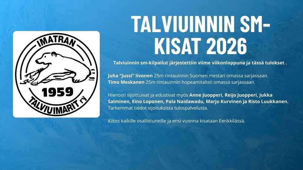 Sm-kilpailut on kisattu viime viikonloppunna ja tässä tulokset. Oheisesta linkistä pääset tutkimaan tarkempia tuloksia. https://online4.tulospalvelu.fi/tulokset-new/fi/2026_pajulahtisu/