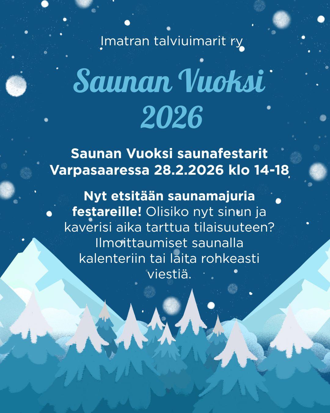 Imatran Talviuimarit ry on perustettu vuonna 1959. Saunamme sijaitsee luonnonkauniilla paikalla Vuoksen varrella Varpasaaressa ja on avoinna ympäri vuoden.