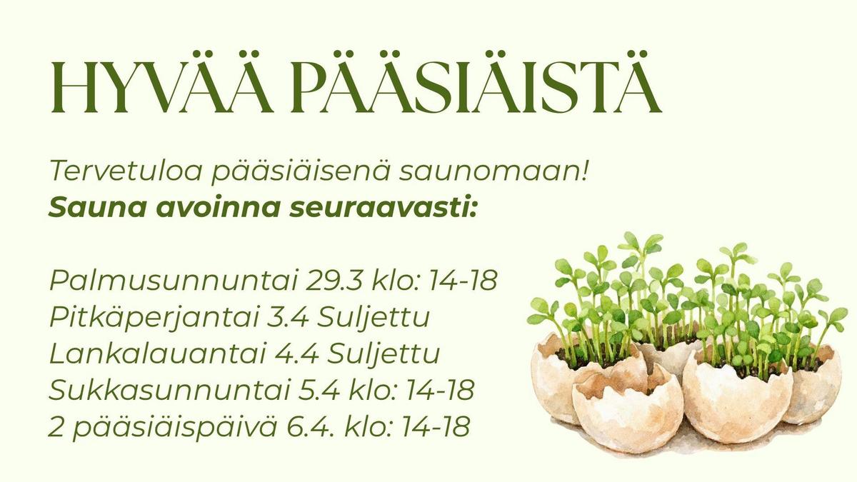 Tervetuloa saunomaan pääsiäisenä seuraavasti.