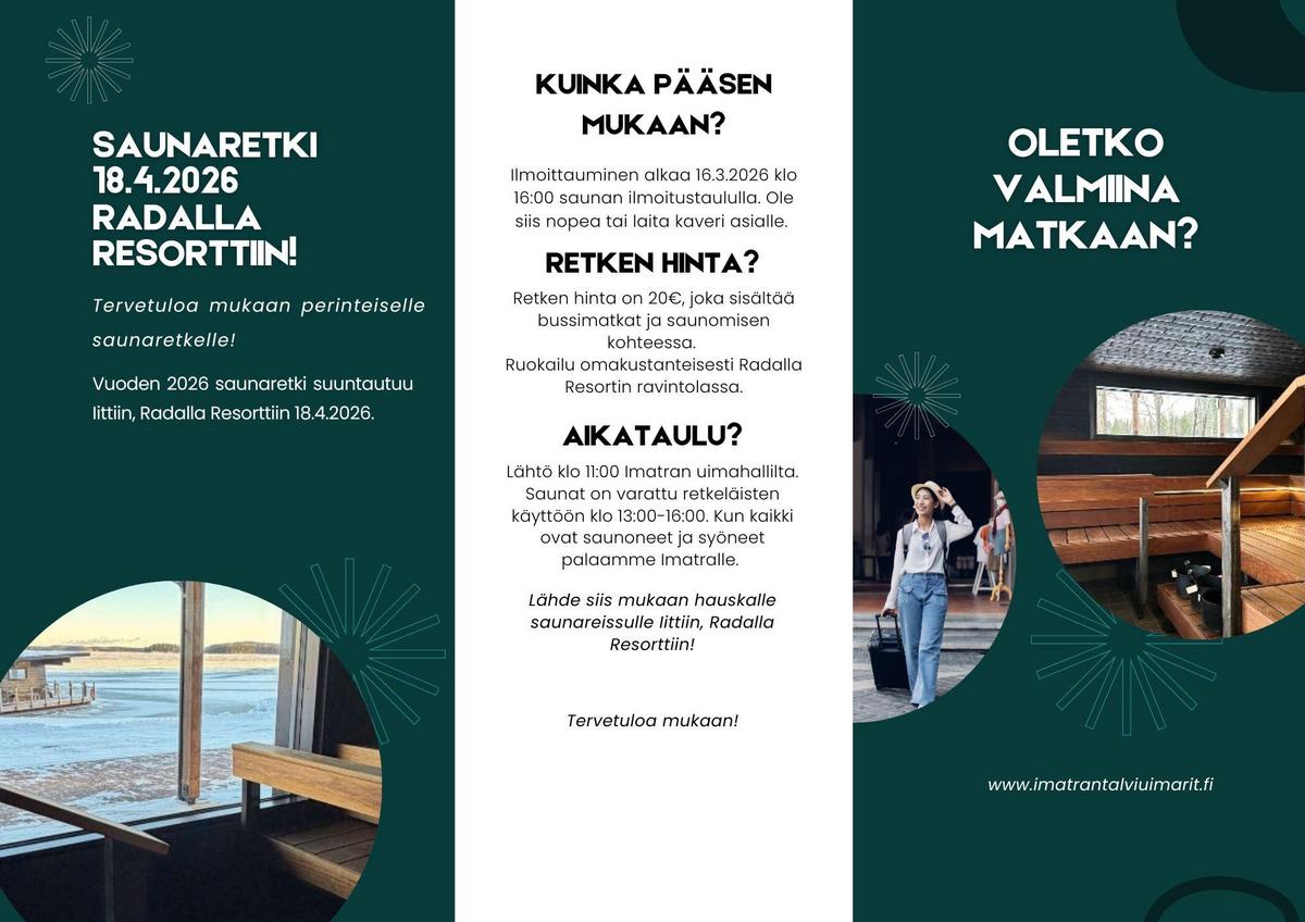 Saunaretki 18.4.2026 tarkemmat tiedot ja ohjeet ilmoittaumiseen.