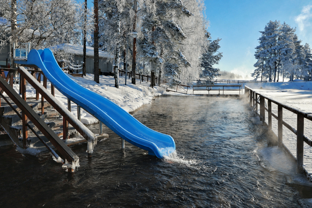 Pian voit valita perinteisen portaikon sijaan vauhdikkaan laskun – liukumäki johdattaa sinut sulavasti suoraan hyiseen veteen. Ensimmäisten testien mukaan lasku kestää noin 2 sekuntia ja saa sykkeen nousemaan tehokkaammin kuin yksikään alkulämmittely!